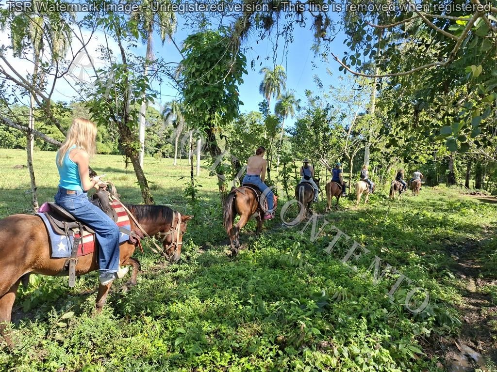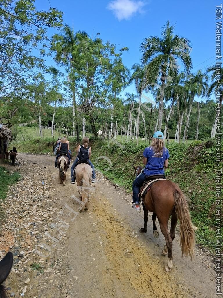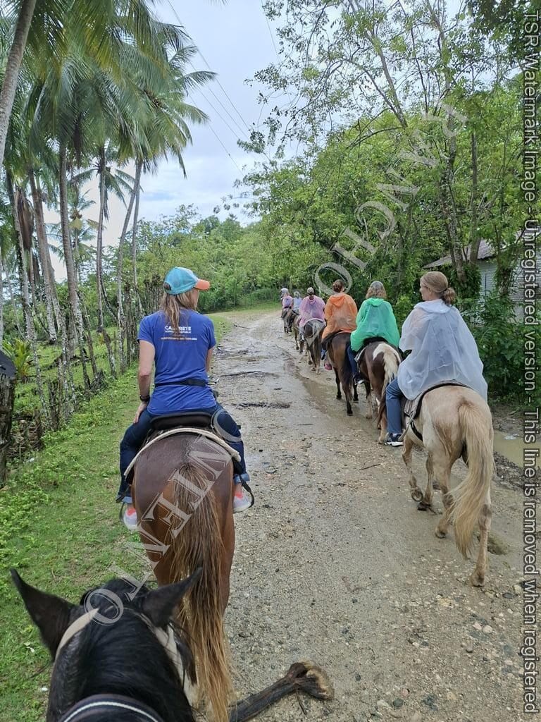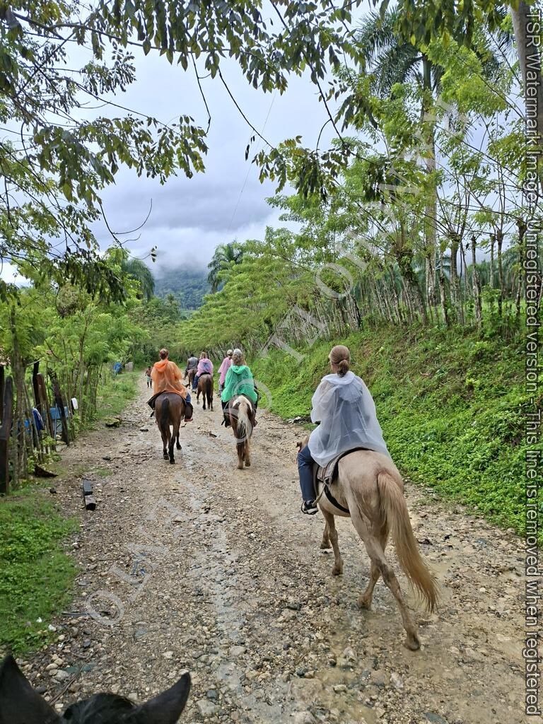 Berge und Fluß – heute hatten wir Womenpower , eine Gruppe mit 10 Mädels . Von Anfänger bis zur gut erfahrenen Reiterin . Das Wetter , am Anfang noch Regen , doch die Mädels sagten kein Problem . Also die Regenponchos an und los gings . Nach etwa 10 Minuten hörte es auch schon auf zu regnen und nach der ersten Pause hatten wir Sonnenschein . Nach dem Ausritt ging es noch zu Rugama Tours zum Mittagessen und einer Gartenführung . Ein sehr schöner Tag mit tollen Gästen . Danke an Melissa, Kathy, Susan, Lauren, Josina, Laurel, Liz, Christina, Josie und Lena vom Seawinds Cabarete – und danke an das Team von Rugama für die gute Bewirtung und das leckere Mittagessen