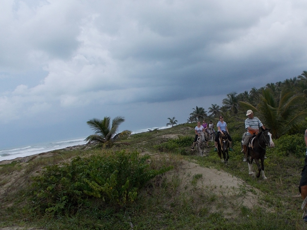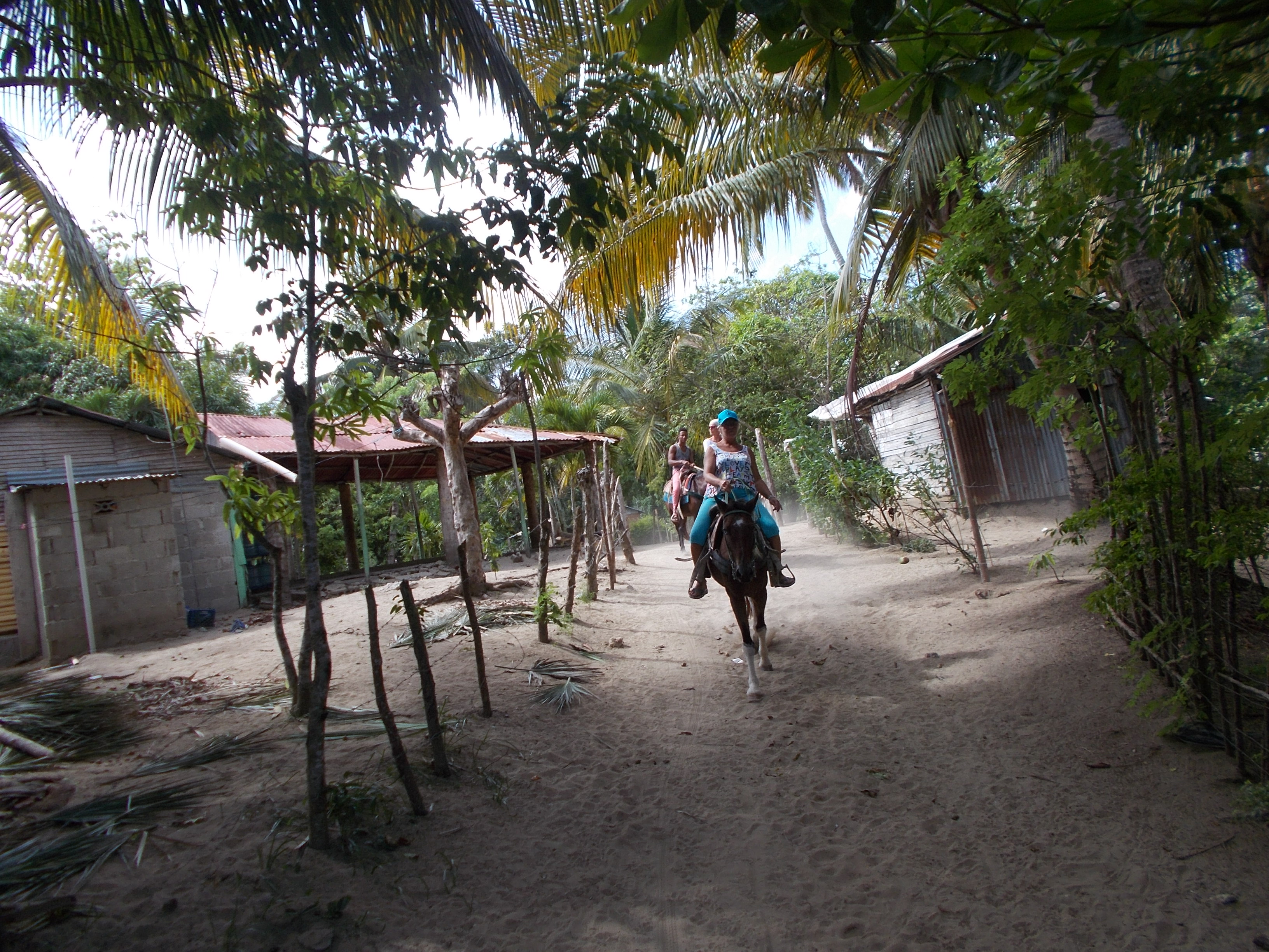 heute Nachmittag ritten wir durch typisch dominikanische Dörfer bis zum einsamen Sandstrand – dort machen wir einen schönen Galopp , den wir noch trocken durchführen konnten , denn danach fing das Gewitter an , Blitz , Donner, und viel Regen – wir suchten uns schnell einen Unterstand , doch der war nicht gerade Wasser dicht – nach einer weile ritten wir weiter und der regen lies nach – doch wir waren komplett durchnässt – Trotzdem hatten wir unsren Spaß und wir bedanken uns an alle Mitreiter und hoffen das beim nächsten mal es wieder trockener ist 🙂